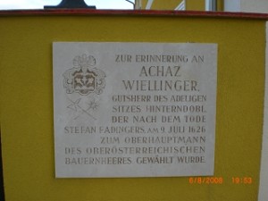In der Weiberau, wo die Bauern ein Lager mit 8000 Mann errichtet hatten, war Oberkommandant der Ritter Achatz Willinger von der Au, Besitzer von Aistersheim und Hinterndobl, welcher an Stelle Fadingers am 9.Juli zum Oberanführer der Bauern erwählt wurde. Generalwachtmeister Freiherr von Lindlo, der die Bauern aus der Weiberau vertreiben wollte, wurde im Pramwald von 10.000 Bauern aufgegriffen und vollständig besiegt. Bei Eferding, Gmunden und Wolfseck [Wolfsegg] wurden die Bauern aber besiegt. Am 16.August befand sich Achatz Willinger mit 2.000 Bauern in der Nähe vom Schlosse Gschandt, wo er vom Oberst Löbl angegriffen wurde. Mehr als 1.000 Bauern wurden erschlagen. Willinger selbst an der linken Hand durch eine Kugel verwundet. Er flüchtete sich nach Steyer, wo ihm der Stadtchirurge die Kugel herausschnitt. Den 27.August war Willinger mit 2.000 Bauern in Wels, wohin Oberst Löbl vorrückte und ihn zur Übergabe aufforderte. Nach kurzer Unterredung zogen die Bauern ab. Im Dezember wurde Achatz Willinger mit circa 100 anderen Rebellen von Oberst Löbl zu Peuerbach gefangen genommen, in Ketten nach Linz geführt und dort am 26.März 1627 enthauptet. Sein Leichnam wurde in einen Sarg gelegt und ehrlich begraben. Er hinterließ nur einen Sohn Johann Ernest, der in zweiter Ehe mit Anna Renata, geb. von Klam verehelicht war. Diese seine 2. Frau starb zu Hinterndobl, den 15. Jänner 1690 und er am 3.August desselben Jahres.